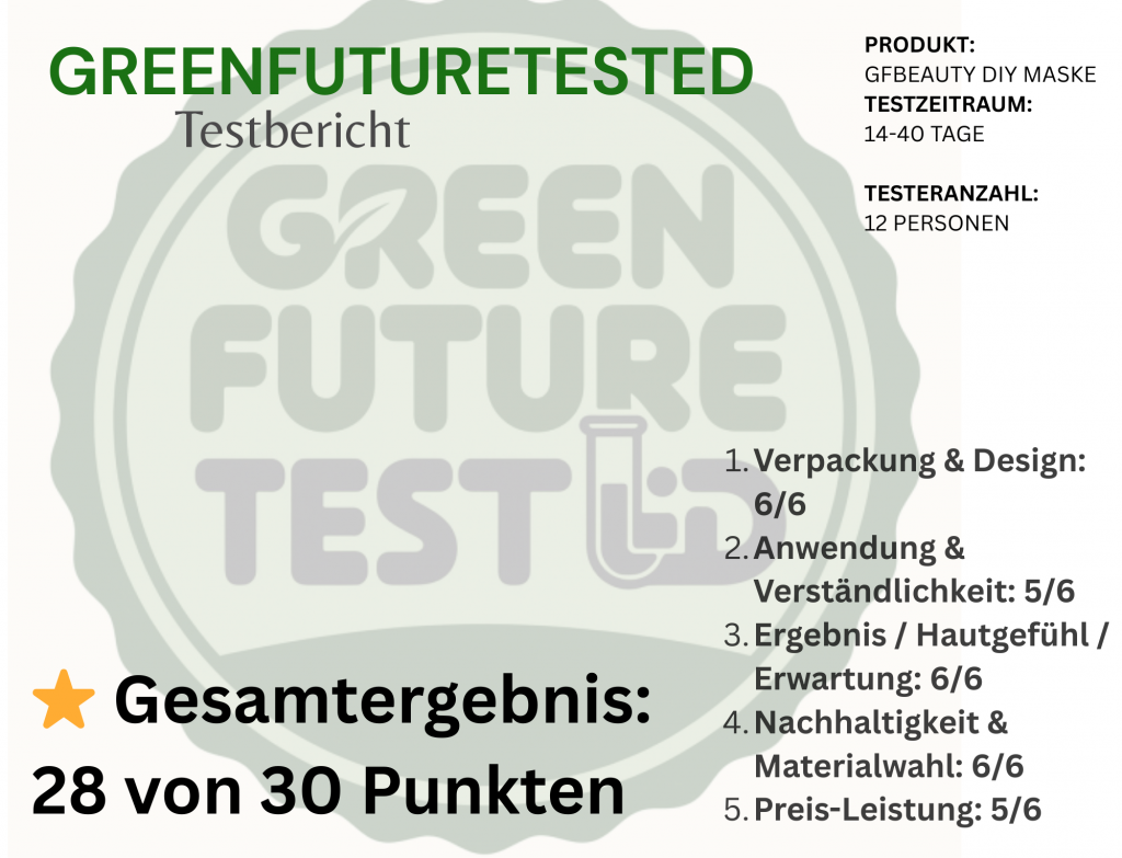 Testerinnen von GREENFUTURETESTED bewerteten das DIY-Produktkonzept als hochwertig, natürlich und gut verträglich. Die nachhaltige Glasverpackung und die einfache Anwendung wurden besonders positiv hervorgehoben.